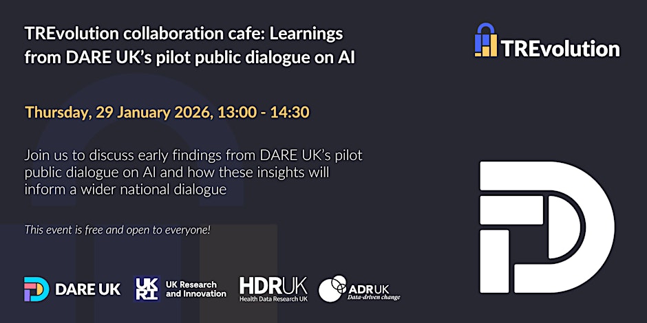 This session will look at how Artificial Intelligence (AI) is being introduced and used in Trusted Research Environments (TREs), share the initial findings from DARE UK’s Pilot Public Dialogue on AI and develop the focus of their wider Public Dialogue on AI, which will take place UK-wide over the course of 2026.